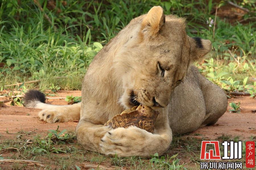 肯尼亞獅子捉了只烏龜當“零食” 啃不到肉肉好生氣!