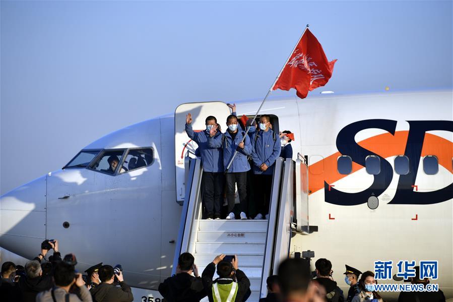 3月17日,醫(yī)療隊隊員抵達山東濟南遙墻國際機場。新華社發(fā)(饒琦攝)