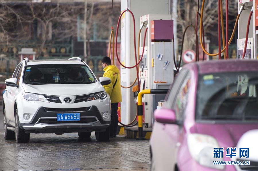 3月17日,吉林省長春市一處加油站工作人員為車輛加油。 新華社記者 許暢 攝