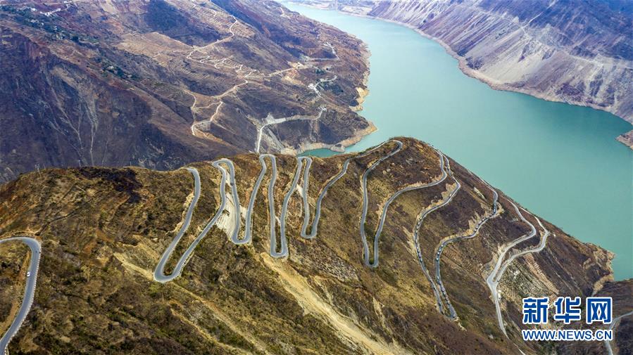 搬家的車隊(duì)行駛在金沙江畔的盤山公路上,江對岸是四川省金陽縣(3月15日攝)。 新華社記者 江文耀 攝
