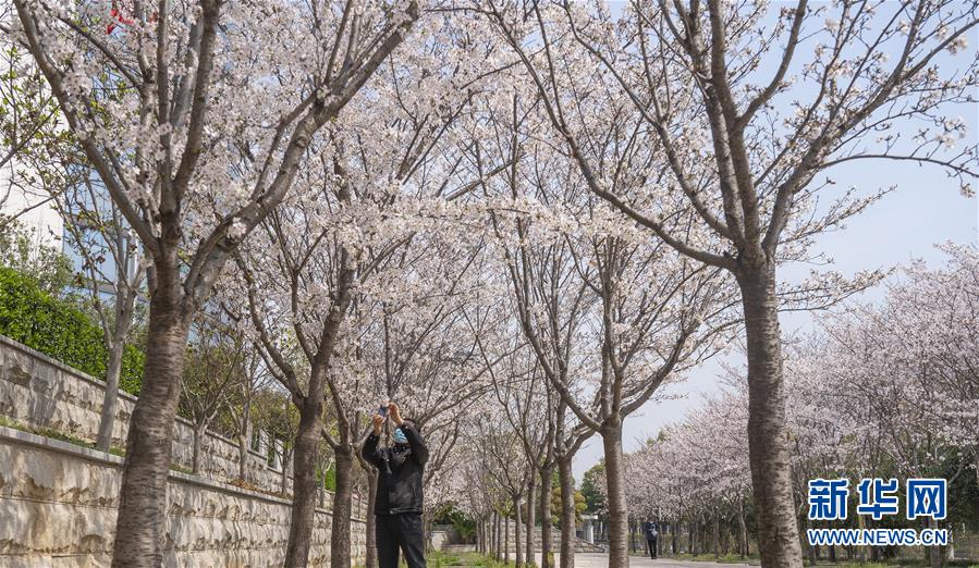 3月19日,在武漢市武昌區(qū)被網友稱為“武漢最美停車場”的湖北日報停車場,一名工作人員在拍攝櫻花。 新華社記者 才揚 攝