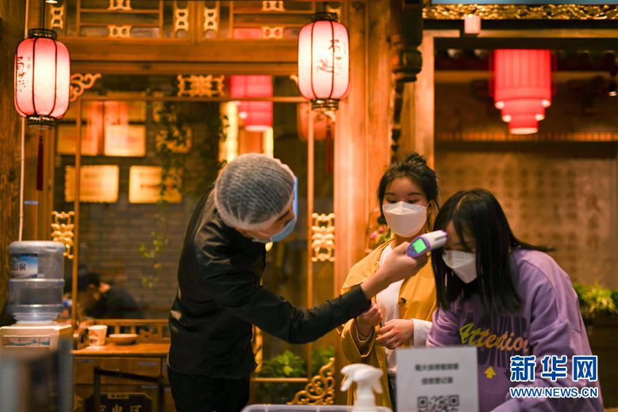 3月21日,在四川省成都市的一家火鍋店門口,顧客在登記信息,接受體溫檢測(cè)。近日,在做好新冠肺炎疫情防控措施的基礎(chǔ)上,四川省成都市的火鍋店逐漸恢復(fù)營(yíng)業(yè)。新華社記者唐文豪攝