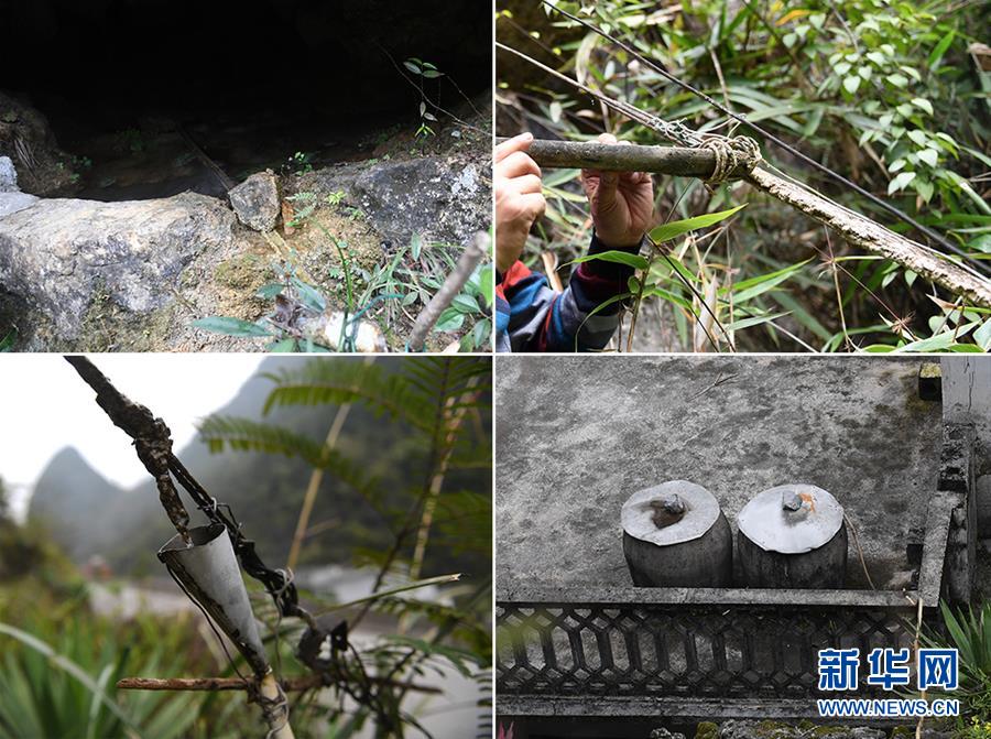 這張拼版圖片顯示廣西都安瑤族自治縣澄江鎮(zhèn)自成村加倫屯村民黃景飛獨(dú)創(chuàng)的“鐵線引水”法(2018年3月16日攝)。左上圖為竹枧將山泉水從山洞引出;右上圖為竹枧將山泉水引到鐵線上;左下圖為一個(gè)特制的漏斗將水接入膠管里;右下圖為膠管將山泉水送到水缸里。廣西有近一半貧困人口生活在石漠化地區(qū),涉及數(shù)十個(gè)縣區(qū)。這里也是廣西飲水保障程度最低的地區(qū),解決貧困人口飲水問(wèn)題是廣西脫貧攻堅(jiān)戰(zhàn)“硬仗中的硬仗”?!笆濉币詠?lái),廣西加快實(shí)施農(nóng)村飲水安全鞏固提升工程。因地制宜,采取新建、擴(kuò)建及管網(wǎng)延伸等多種措施,補(bǔ)齊貧困地區(qū)水利薄弱短板,進(jìn)一步提升石漠化地區(qū)群眾飲水安全保障水平,助推脫貧攻堅(jiān)。新華社記者陸波岸攝