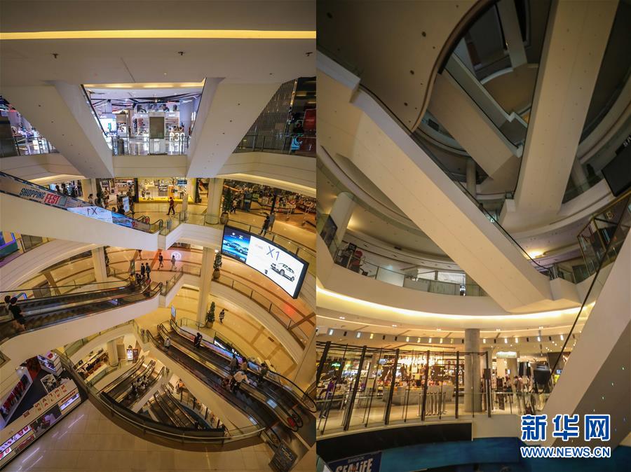這是3月21日拍攝的泰國(guó)曼谷暹羅百麗宮商場(chǎng)(左圖)和3月22日拍攝的停止?fàn)I業(yè)的商場(chǎng)的對(duì)比圖。新華社記者張可任攝
