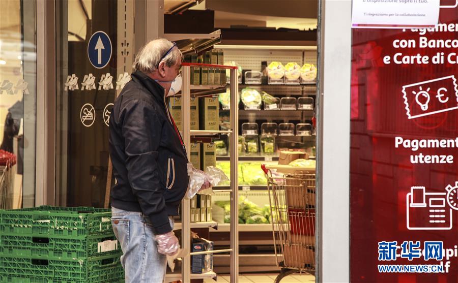 3月14日,在意大利首都羅馬,一名超市工作人員拿著手套,準(zhǔn)備發(fā)放給顧客。