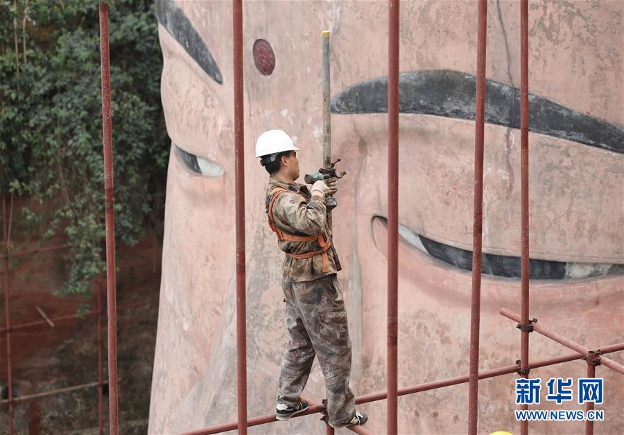 12月10日前后已逐步遮蔽大佛頭部,對頭面部進行勘測;12月底將開始拆除頭部腳手架,保證2019年元旦節(jié)之前,先露出佛頭,供游客觀賞。