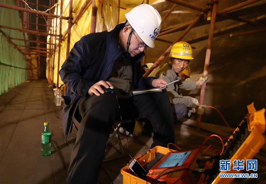 中鐵西北科學研究院有限公司文保中心的工程師孫博(左)在檢測探頭的數(shù)據(jù)穩(wěn)定性(3月18日攝)。新華社記者江宏景攝