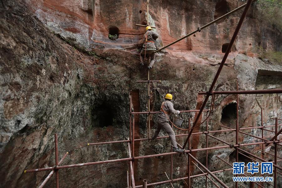 中鐵西北科學研究院有限公司文保中心的工作人員對大佛巖體進行保護性清理(3月17日攝)。新華社記者江宏景攝