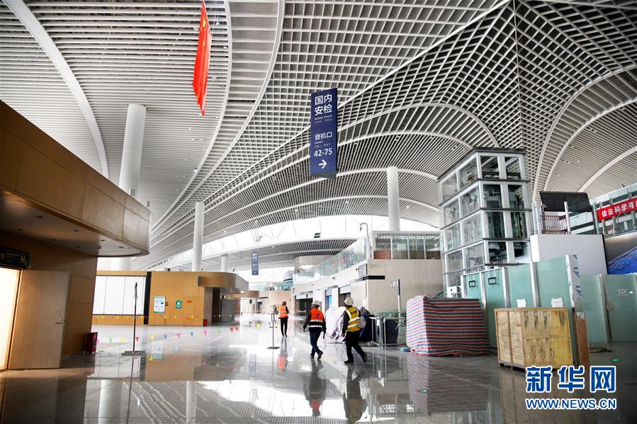 3月25日,兩名工程技術(shù)人員從建設(shè)中的青島膠東國際機場航站樓出發(fā)大廳走過。新華社記者李紫恒攝