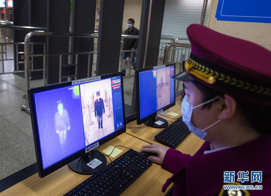 3月23日,在漢口火車站地鐵站,工作人員在測試測溫系統(tǒng)。該車站的2個入口處,已經(jīng)安裝了電子測溫儀器,只要有乘客通過,就會在電腦顯示屏上出現(xiàn)體溫的數(shù)據(jù),監(jiān)控進(jìn)站乘客體溫。新華社記者肖藝九攝