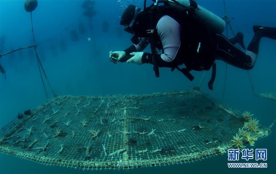 3月28日,在位于海南三亞蜈支洲島旅游區(qū)的海洋牧場(chǎng),工作人員在清理附著在珊瑚上的漁網(wǎng)。近日,位于海南三亞蜈支洲島旅游區(qū)的海洋牧場(chǎng)復(fù)工,海底作業(yè)逐漸恢復(fù)正常,開(kāi)始進(jìn)行人工魚(yú)礁吊裝擺位、水下監(jiān)控清理以及日常巡護(hù)等工作。據(jù)介紹,人工魚(yú)礁有利于魚(yú)類(lèi)種類(lèi)增加和數(shù)量提高,蜈支洲島海域海洋牧場(chǎng)人工魚(yú)礁表面附著珊瑚、貝類(lèi)、藻類(lèi)等生物種類(lèi)達(dá)120余種。新華社記者楊冠宇攝