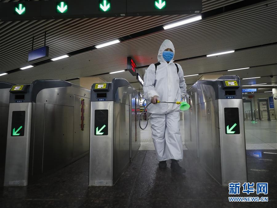 3月23日,在漢口火車(chē)站地鐵站,保潔人員在為站廳消毒。新華社記者沈伯韓攝