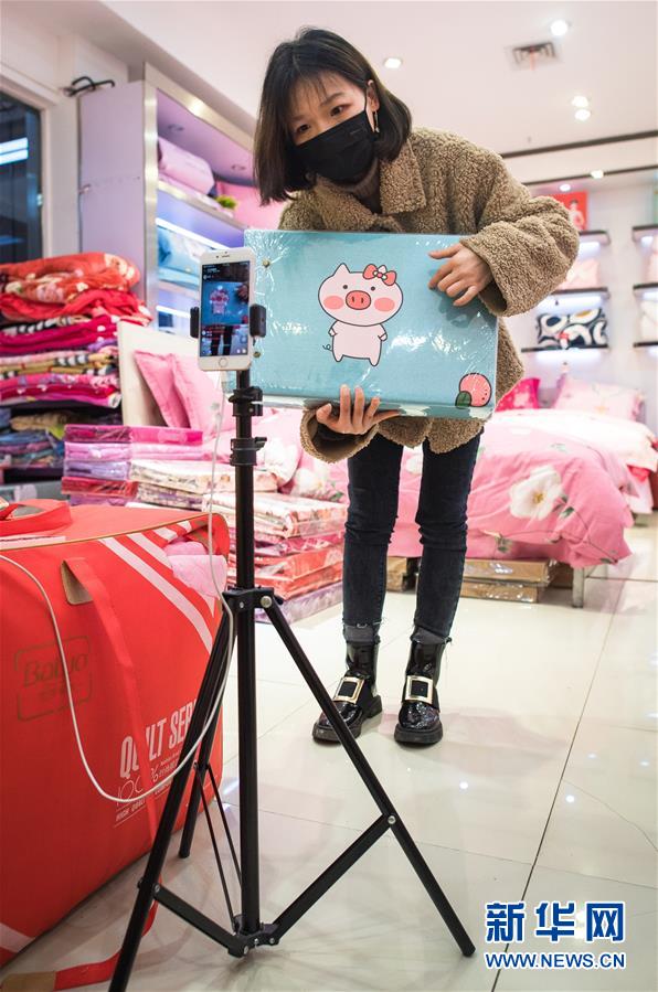 3月29日,在漢口北市場(chǎng),一名主播在直播平臺(tái)直播銷售床上用品。新華社記者肖藝九攝