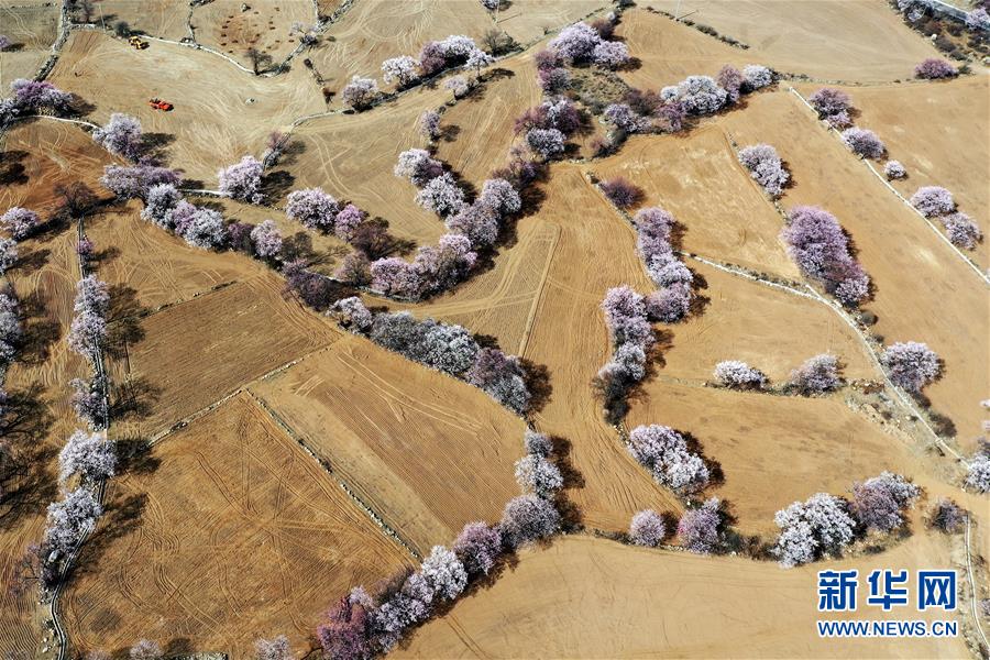 西藏林芝市波密縣境內(nèi)桃花盛開的田園風(fēng)光(無人機(jī)照片,3月26日攝)。新華社記者 詹彥 攝
