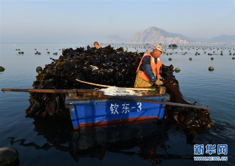 海島居民們在養(yǎng)殖區(qū)收割海帶(5月24日攝)。新華社記者朱崢攝