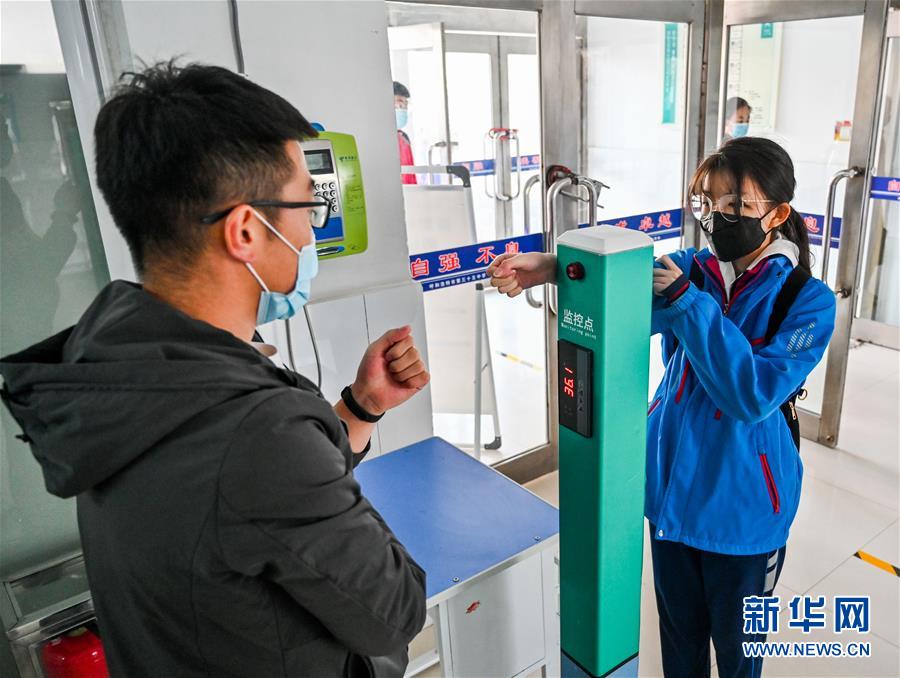 3月30日,呼和浩特市第三十五中學(xué)初三年級(jí)學(xué)生進(jìn)入教學(xué)樓時(shí)測(cè)量體溫。當(dāng)日,內(nèi)蒙古自治區(qū)全區(qū)高三和初三年級(jí)開學(xué)復(fù)課。新華社記者連振攝