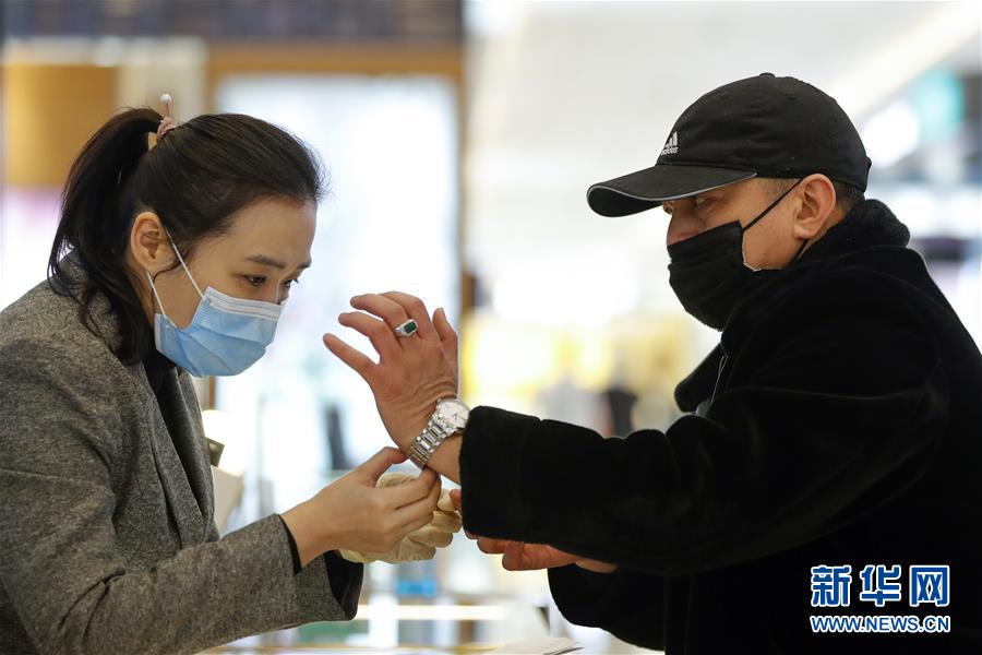 3月30日,在武漢市武商世貿(mào)廣場,一名顧客(右)在挑選手表。當(dāng)日,武漢市多家商場開門迎客。新華社記者沈伯韓攝