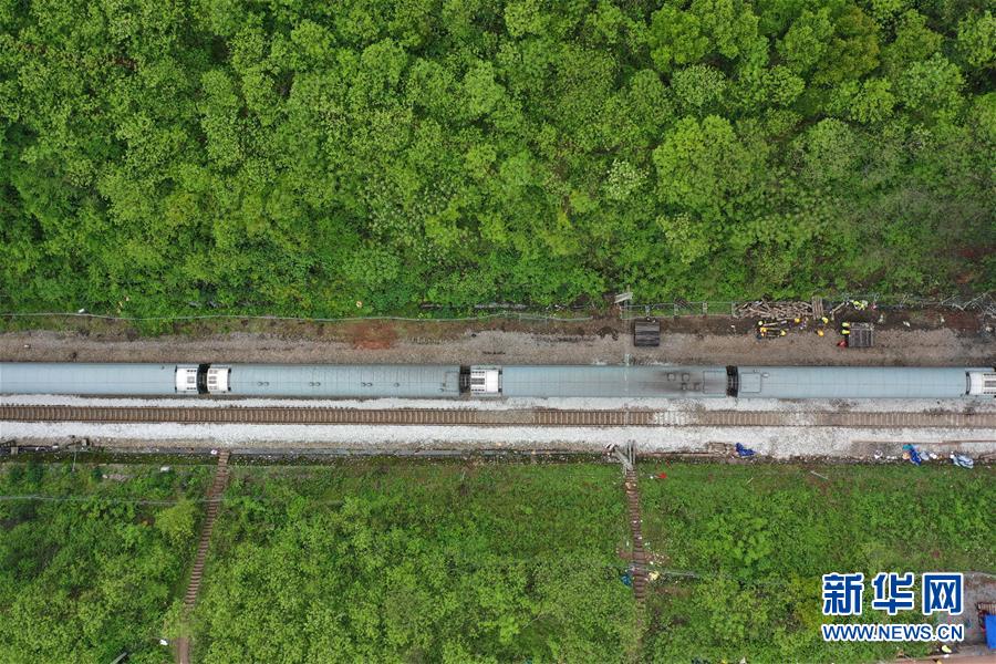 4月1日,Z201次旅客列車通過京廣鐵路郴州段脫軌事故區(qū)段(無人機(jī)照片)。新華社記者李尕攝