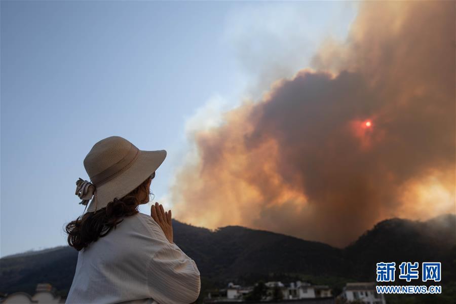 3月31日,一名女士遠(yuǎn)望著火災(zāi)現(xiàn)場(chǎng)祈禱。新華社記者江宏景攝