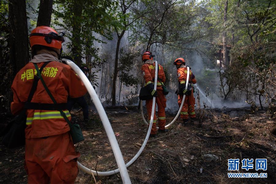 4月1日,在西昌市邛海瀘山景區(qū)臥云山莊旁,消防隊(duì)員在儲(chǔ)水。新華社記者胥冰潔攝