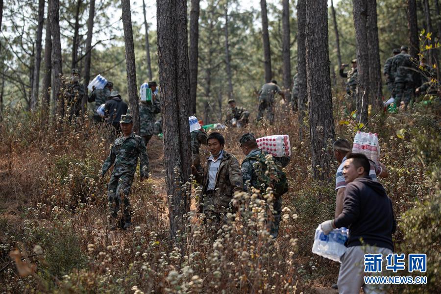 4月1日,西昌市當(dāng)?shù)氐母刹咳罕娤蚧饒?chǎng)運(yùn)送礦泉水,為撲火隊(duì)員提供生活物資保障。新華社記者江宏景攝