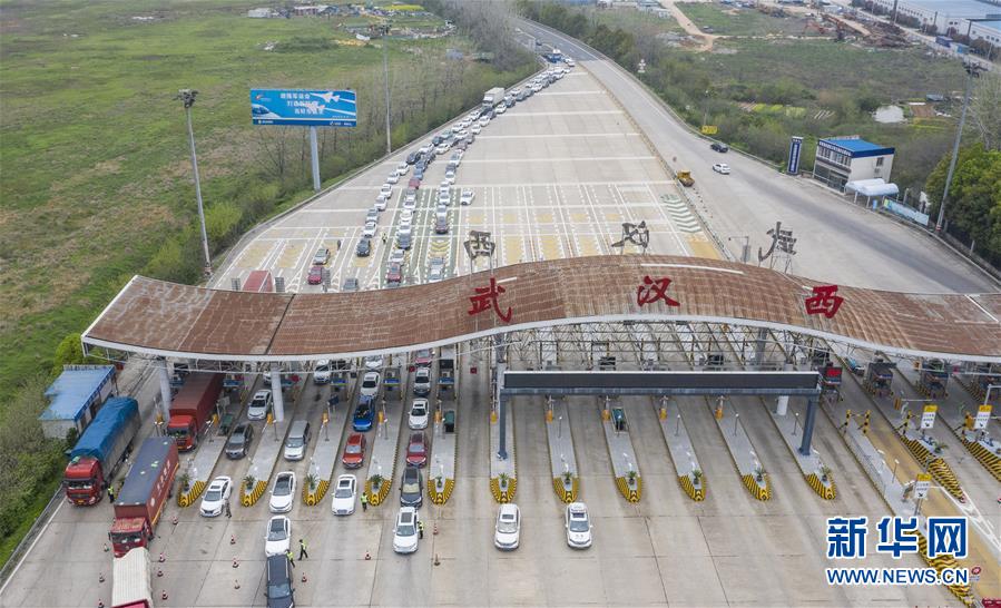3月24日,在武漢西高速收費(fèi)站交通卡點(diǎn),返漢車(chē)輛排隊(duì)等候入城(無(wú)人機(jī)照片)。新華社記者才揚(yáng)攝