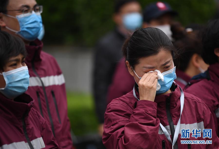 4月3日,來自西安交通大學(xué)第一附屬醫(yī)院的醫(yī)療隊隊員王沙沙(前)在送別“戰(zhàn)友”后落淚。 當(dāng)日,陜西省第一批援鄂醫(yī)療隊137名隊員在陜西省工人療養(yǎng)院結(jié)束了為期兩周的隔離休養(yǎng)。醫(yī)療隊員與“戰(zhàn)友”深情作別后,陸續(xù)踏上歸途。 新華社記者 李一博 攝