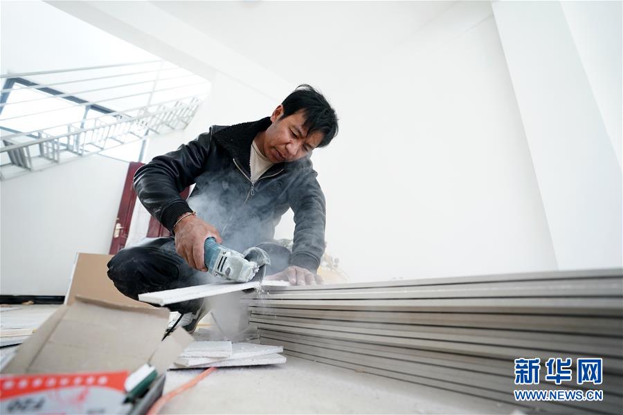 在拉薩市堆龍德慶區(qū)古榮鄉(xiāng)榮瑪高海拔生態(tài)搬遷點扶貧綜合門面房,尼加在為一家店鋪做裝修(4月2日攝)。2018年,尼加搬遷到榮瑪高海拔生態(tài)搬遷點后,和朋友合伙從事裝修工作。新華社記者 詹彥 攝