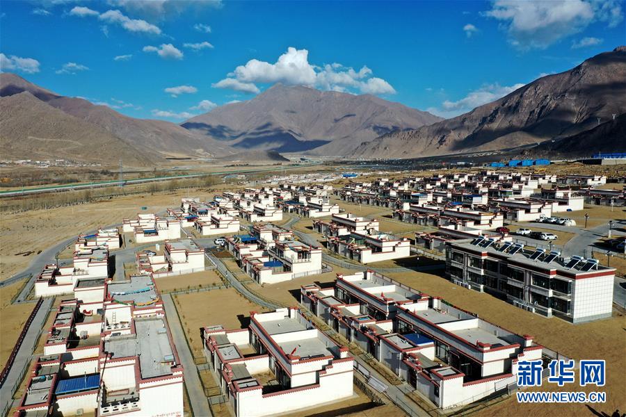 拉薩市堆龍德慶區(qū)古榮鄉(xiāng)榮瑪高海拔生態(tài)搬遷點一景(4月1日攝,無人機照片)。新華社記者 詹彥 攝