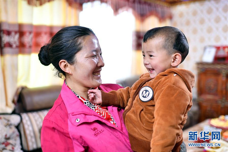 在拉薩市堆龍德慶區(qū)古榮鄉(xiāng)榮瑪高海拔生態(tài)搬遷點,白瑪洛宗抱著孩子在客廳里(4月1日攝)。2018年,白瑪洛宗一家7口人告別了尼瑪縣榮瑪鄉(xiāng)藏曲村75平米的舊房子,搬到了榮瑪高海拔生態(tài)搬遷點150平米的新居。新華社記者 詹彥 攝