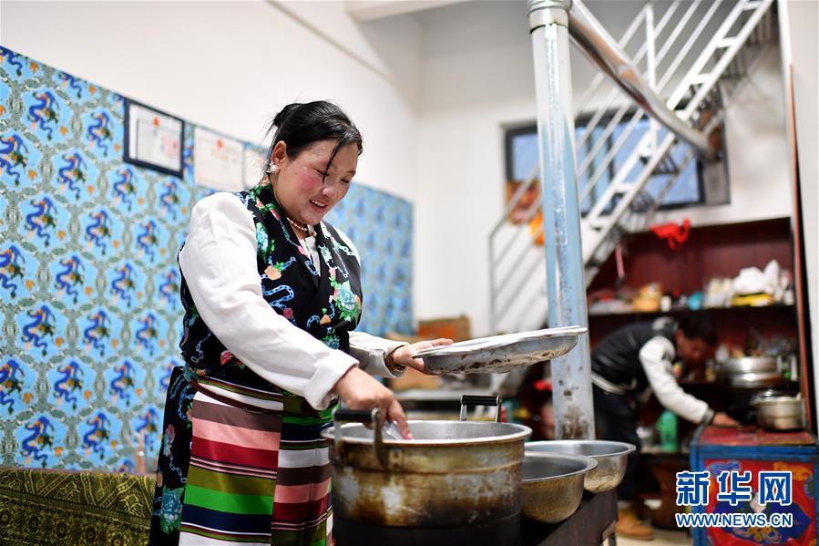 在拉薩市堆龍德慶區(qū)古榮鄉(xiāng)榮瑪高海拔生態(tài)搬遷點,歐措(左)和兒子索朗普布在自家開的藏餐館里忙碌(4月1日攝)。新華社記者 詹彥 攝