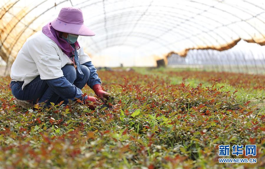 4月13日,在八角臺街道雅化村花圃內(nèi),一名花農(nóng)整理宿根花卉。新華社記者姚劍鋒攝