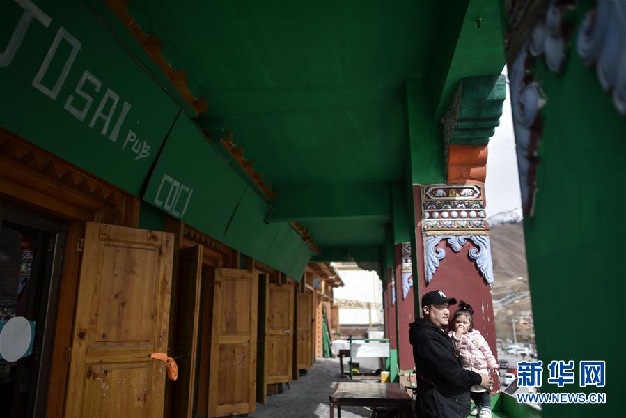 4月10日,才仁俄賽和女兒在餐廳門口遠眺玉樹街景。新華社記者吳剛攝