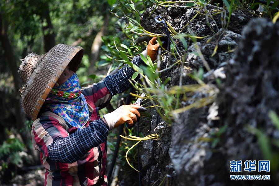 4月21日,施茶村村民黃風厲在石斛園清理雜草。新華社記者郭程攝