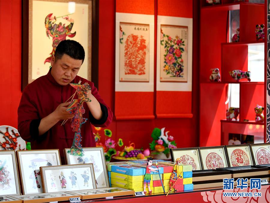 4月23日,在西安大唐不夜城步行街一家民俗產(chǎn)品商店,工作人員整理貨品。 新華社記者 張博文 攝