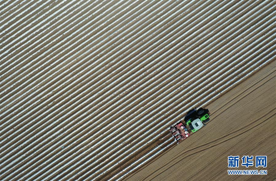 4月25日,灤南縣東黃坨鎮(zhèn)新戶村農民使用拖拉機給準備栽植煙薯秧苗的土地開溝覆膜(無人機照片)。近年來,河北省灤南縣利用當?shù)赝寥篮蜌夂蛱攸c,引導農民因地制宜發(fā)展煙薯種植,取得良好效果。目前該縣煙薯種植面積達3萬多畝,每畝年收入達5000多元。新華社記者楊世堯攝