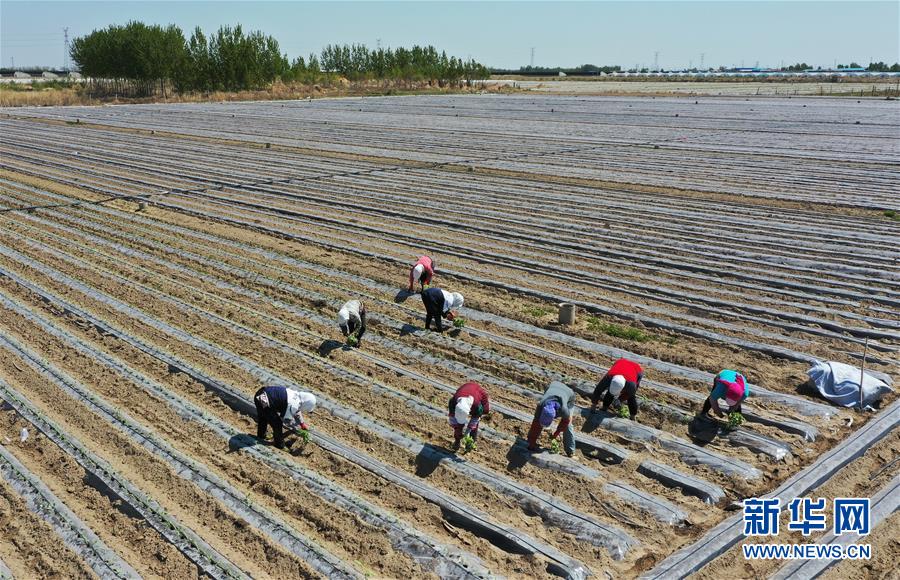 4月25日,灤南縣東黃坨鎮(zhèn)新戶(hù)村農(nóng)民在田間栽植煙薯秧苗(無(wú)人機(jī)照片)。近年來(lái),河北省灤南縣利用當(dāng)?shù)赝寥篮蜌夂蛱攸c(diǎn),引導(dǎo)農(nóng)民因地制宜發(fā)展煙薯種植,取得良好效果。目前該縣煙薯種植面積達(dá)3萬(wàn)多畝,每畝年收入達(dá)5000多元。新華社記者楊世堯攝