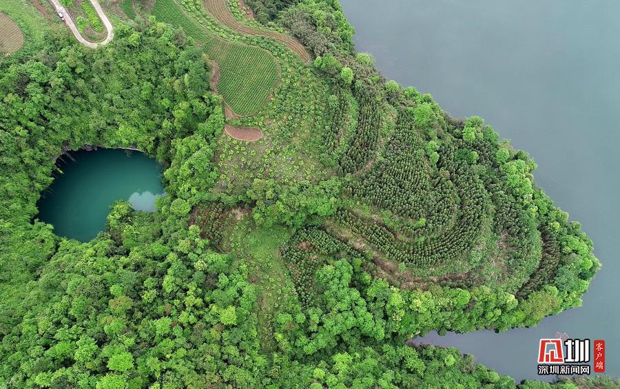 2020年4月24日,在湖南張家界市永定區(qū)“百里畫廊”茅巖河景區(qū)拍攝的“天坑心湖”。(無人機(jī)拍攝)