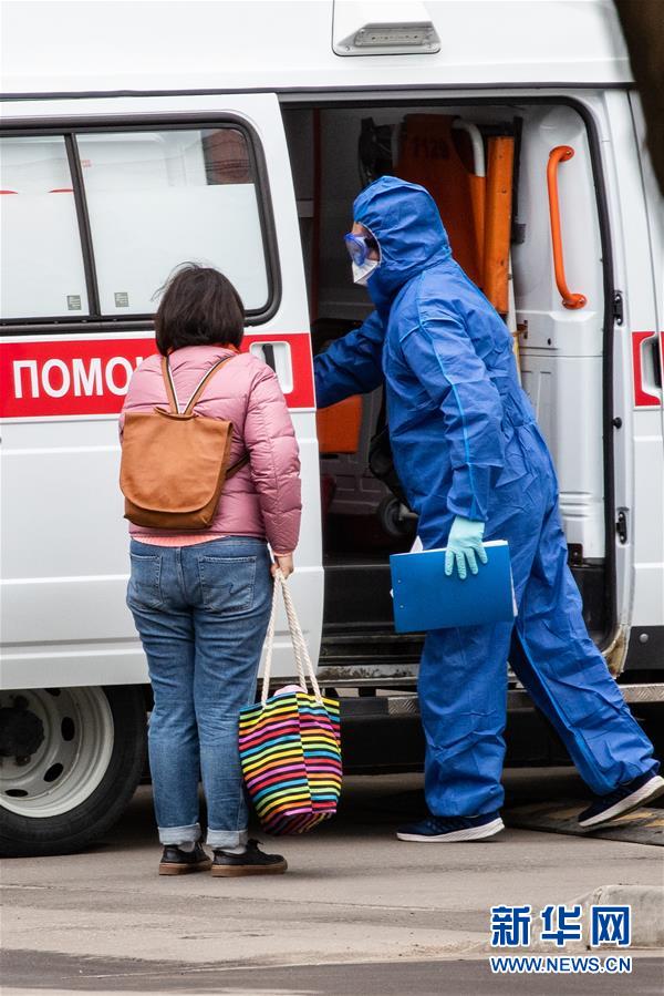 4月27日,在俄羅斯首都莫斯科,醫(yī)護(hù)人員(右)引導(dǎo)一名女子走上救護(hù)車。據(jù)俄羅斯防疫指揮部27日消息,過去24小時俄新增新冠肺炎確診病例6198例,累計確診87147例,單日增幅7.66%。新華社記者白雪騏攝