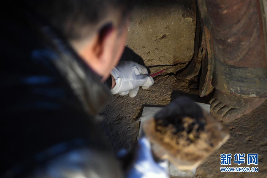 12月25日,在麥積山石窟第11窟,修復師牟常有對塑像破損處進行加固處理。新華社記者馬寧攝