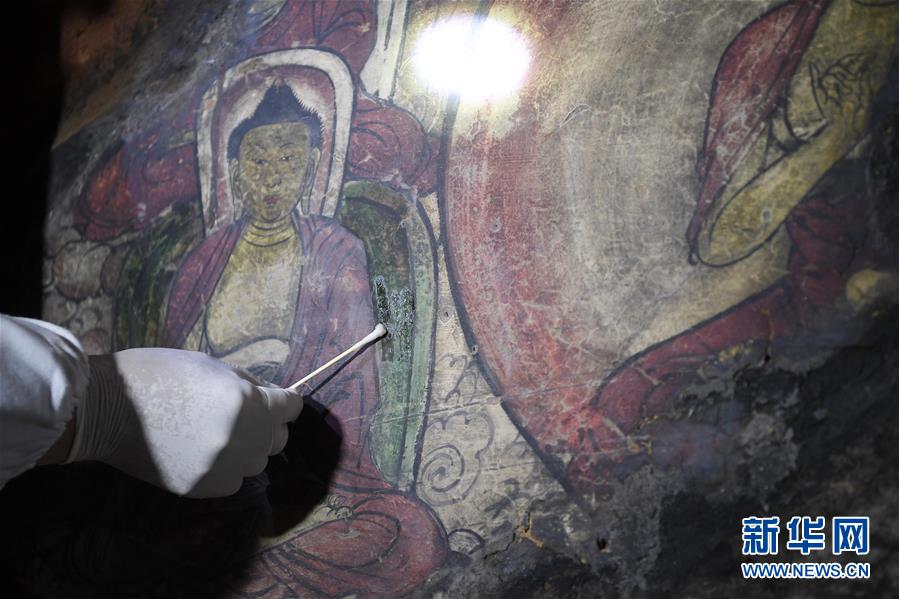 4月27日,文物修復專家在寧夏須彌山石窟圓光寺48號窟內(nèi)修復壁畫。新華社記者王鵬攝