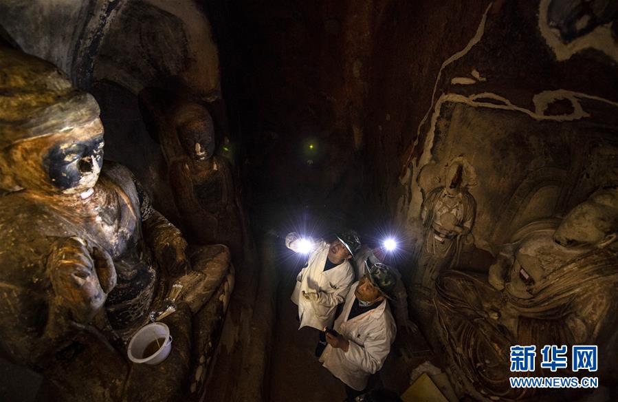 4月27日,文物修復專家在寧夏須彌山石窟圓光寺48號窟內(nèi)開展修復工作。新華社記者馮開華攝
