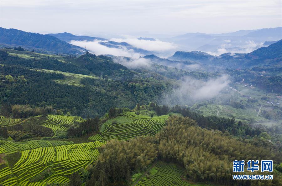 俯瞰鹿鳴茶海一角(4月28日無人機照片)。四川省珙縣的鹿鳴茶海,常年云霧繚繞,茶壟依山分布,美不勝收。新華社記者江宏景攝