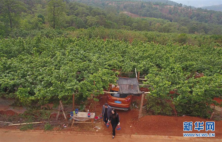 4月28日,游客從云南省富民縣赤鷲鎮(zhèn)普橋村櫻桃園走出(無人機照片)。云南省富民縣赤鷲鎮(zhèn)大力發(fā)展特色種植業(yè),全鎮(zhèn)種植櫻桃4000余畝,幫助當?shù)剞r民增收致富。新華社記者楊宗友攝