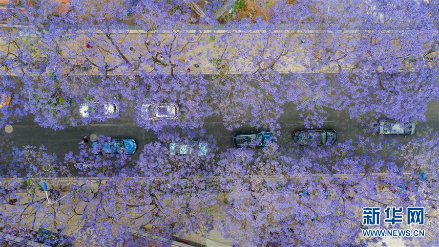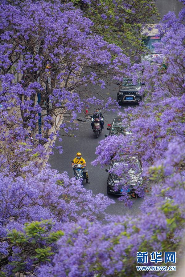 這是5月2日在昆明市教場中路拍攝的藍(lán)花楹。近日,云南省昆明市部分街區(qū)的藍(lán)花楹競相開放,為春城增添靚麗風(fēng)景。新華社記者藺以光攝