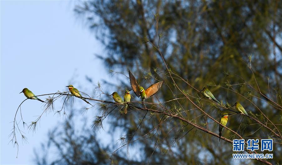 在??谖逶春酉掠畏浠⒈Wo(hù)小區(qū),栗喉蜂虎在樹枝上休息(5月7日攝)。新華社記者楊冠宇攝