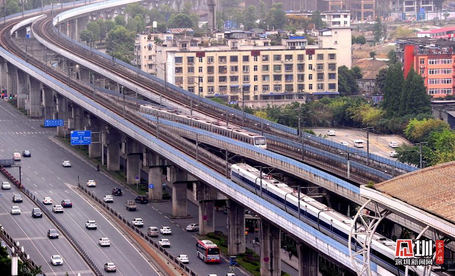 2020年5月11日,四川省成都市,犀浦站是全國首個鐵路與地鐵換乘車站。圖為動車、地鐵同時(shí)運(yùn)行在線路上。