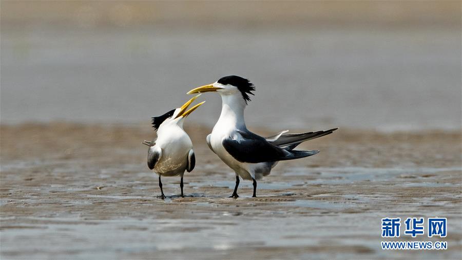 眼下正是大鳳頭燕鷗繁育的時(shí)節(jié),在福建閩江河口濕地核心區(qū)鱔魚(yú)灘的沙洲上,大鳳頭燕鷗正相互嬉戲(5月9日攝)。新華社記者梅永存攝