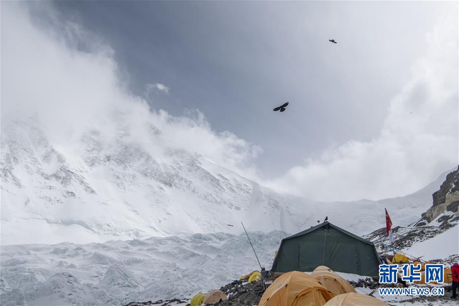 在海拔6500米的珠峰前進(jìn)營(yíng)地,幾只黃嘴山鴉在空中飛翔(5月10日攝)。新華社記者孫非攝