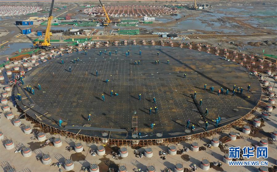 5月23日,工人在唐山市曹妃甸區(qū)LNG項(xiàng)目第一階段工程儲(chǔ)罐建設(shè)工地施工(無人機(jī)照片)。